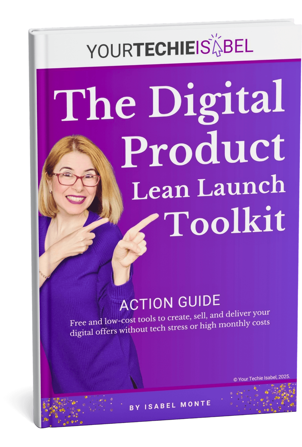 The Digital Product Lean Launch Toolkit is your action guide to starting smart, without the stress, overwhelm, or high costs. Inside, you’ll get a clear breakdown of the exact free and affordable tools I recommend to help you create, sell, deliver, and follow up with your digital offers. This guide outlines the key steps to building a lean, simple system so you can launch your digital product confidently, even on a tiny budget.